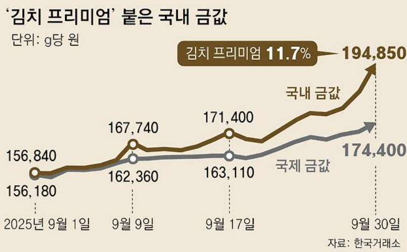 - KRX 금시장 가격: 2025년 9월 말~10월 초 기준, 국내 금 현물 가격은 국제 시세보다 7~11% 높은 수준을 기록했다.